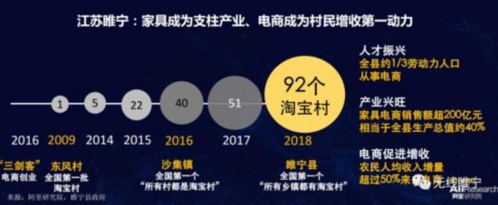 现在,拥有全国最大家具淘宝村集群的睢宁,将家具作为支柱产业,全县三分之一的劳动力人口从事电商。