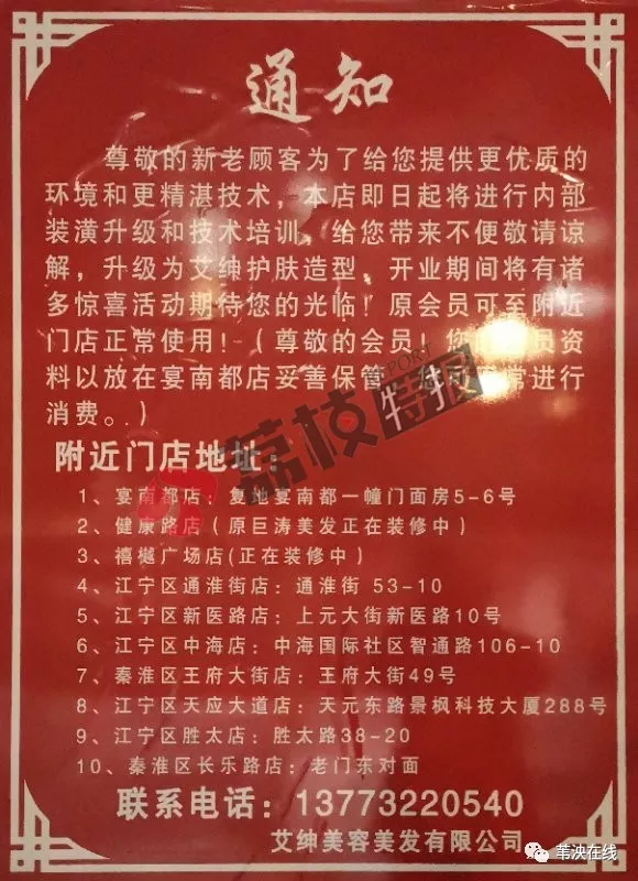 1月16号的江苏新闻广播《苇泱在线》节目中,节目组连线到了艾绅美容美发紫荆广场店的何店长,他表示,艾绅与卡凡、积家两家理发店,没有任何关系,法人已经变更。何店长还表示,只要是能确认此前在紫荆广场店办理的卡凡、积家会员卡,消费者都可以在艾绅正常使用,不用再充值。
