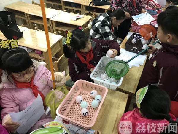 南京金陵汇文学校小学部一年级“期末考试”叫“芽芽闯关”游艺会,共分九关,包括词语捞捞乐、幸运大转盘、课文圈圈乐、算珠拨拨乐等等。有的关卡,孩子们要先做个小游戏来选择考题,例如用大转盘来选择说出哪些汉字的笔顺,用套圈来选择背诵哪些课文段落。