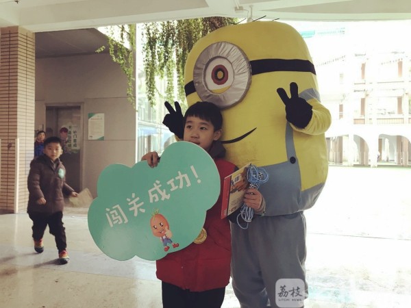 不管是闯关、游艺会还是嘉年华,仪式感都是里面的重要组成部分。芳草园小学给一年级孩子准备的礼物是三样,一枚奖牌,一本书,还有一支有学校LOGO的铅笔。除此之外,孩子们最爱的礼物,是与“小黄人”合影。