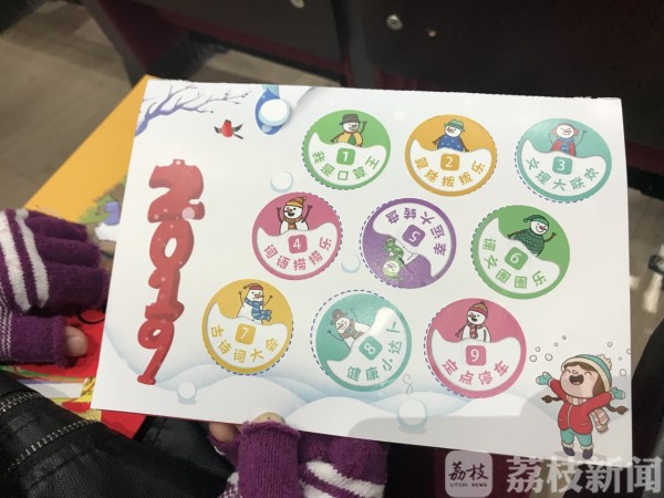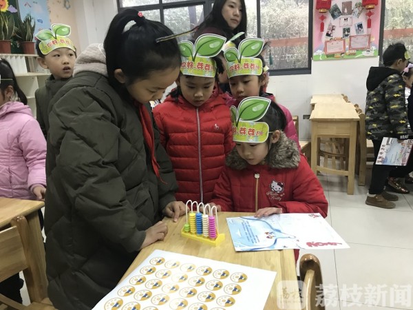 金陵汇文学校一年级的孩子闯完9关、集齐九张贴纸后,可以将佩戴的“芽芽帽”换成“状元帽”,同时可以领取书籍作为奖品。