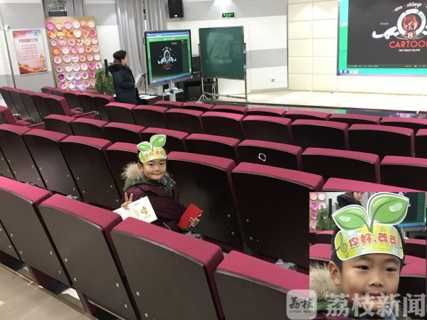 考得快的孩子,还能到小报告厅里一边休息,一边看大屏播放的动画片。这位速度最快的小朋友叫王延嘉,上午9点钟开考,他9点35就闯完所有关卡,一个人来到报告厅,“寂寞”地看着动画片。