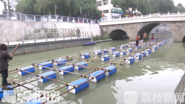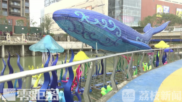 在小西门桥下的护城河上,一只长20米、高6米的大蓝鲸花灯,已经稳稳地固定好。制造水上花灯的工棚在五公里以外,这样的大型灯组是怎么“游”过来的呢?