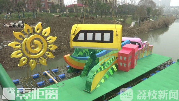 在河的上游,记者见到了水上灯组的组装过程。大型灯彩的灯架都是钢结构的,如果在河面上布置没有支点,难度较大。制灯师傅先用钢管搭好底层基座,然后在基座下固定上数十个定制的漂浮泡沫,再用大型吊车吊进水面,几位师傅用划船的方式,把灯组基座划入预定位置。