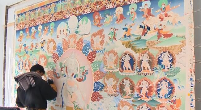 齐吾岗巴画派的特点是颜色更为艳丽,画面的布局都是以宫殿为背景,主尊佛在中间,其余人物等在周围比例比较小。画面布置上以方块格局为主,各类装饰物比较多。唐卡画师次仁罗布表示,现在我们传承齐吾岗巴画派的方式主要是通过修复壁画来学习和记录齐吾岗巴画派的画法和技艺。随着它的知名度越来越高,喜欢的人和学习的人也越来越多,以后他也会多收徒弟,把这项画派传承下去。