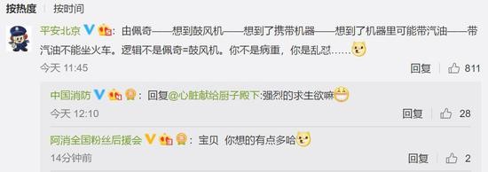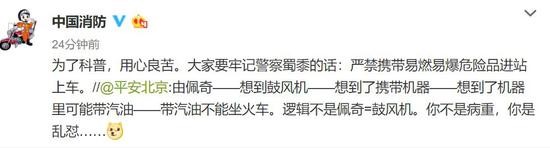 事情还没结束呢,紧接着,平安北京在下面评论回击:由佩奇——想到鼓风机——想到了携带机器——想到了机器里可能带汽油——带汽油不能坐火车,逻辑不是佩奇=鼓风机。你不是病重,你是乱怼……