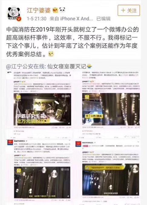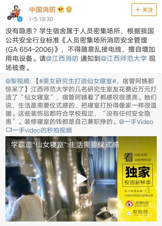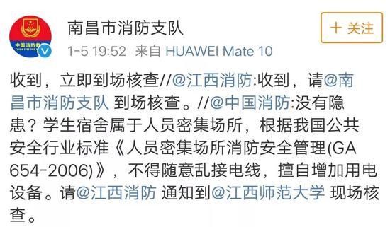 原来,@中国消防1月5日就发现并转载了这条微博,表示:学生宿舍属于人员密集场所,根据我国公共安全行业标准《人员密集场所消防安全管理(GA 654-2006)》,不得随意乱接电线,擅自增加用电设备。请@江西消防 通知到@江西师范大学 现场核查。