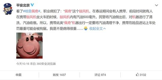 8日上午,@平安北京 发博称,“佩奇”这个鼓风机,在春运期间会有人携带,前段时间就有人在携带鼓风机坐火车的时候,鼓风机内有汽油500毫升。民警将汽油倒出后,对机器进行了清洗,汽油收缴。所以,携带此类“佩奇”机器出行一定要将汽油清理干净,携带危险品进站上车处罚最重可能会被拘留。