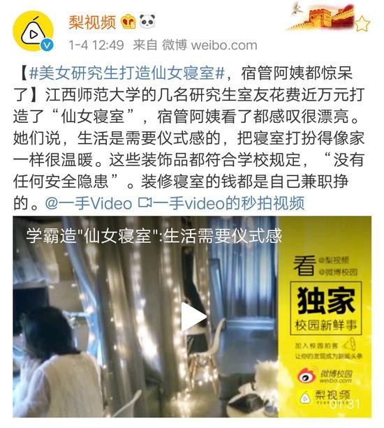 今年一月,江西师范大学的几名研究生室友花费近万元打造了“仙女寝室”,宿舍中布满了星星灯、小彩灯等装饰品。同学们来到她们宿舍都发出赞叹,并为其取名为“仙女寝室”。