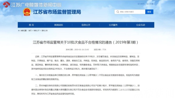 近期,江苏省市场监督管理局完成省级食品安全监督抽检任务359批次,涉及餐饮食品、炒货食品及坚果制品、蛋制品、豆制品、方便食品、蜂产品、糕点、罐头、酒类、粮食加工品、肉制品、乳制品、食品添加剂、食用农产品、食用油、油脂及其制品、蔬菜制品、薯类和膨化制品、水果制品、速冻食品、特殊膳食食品、饮料等21类食品。根据食品安全国家标准检验和判定,其中抽样检验项目合格样品349批次、不合格样品10批次。