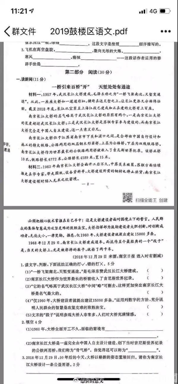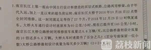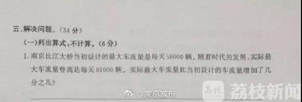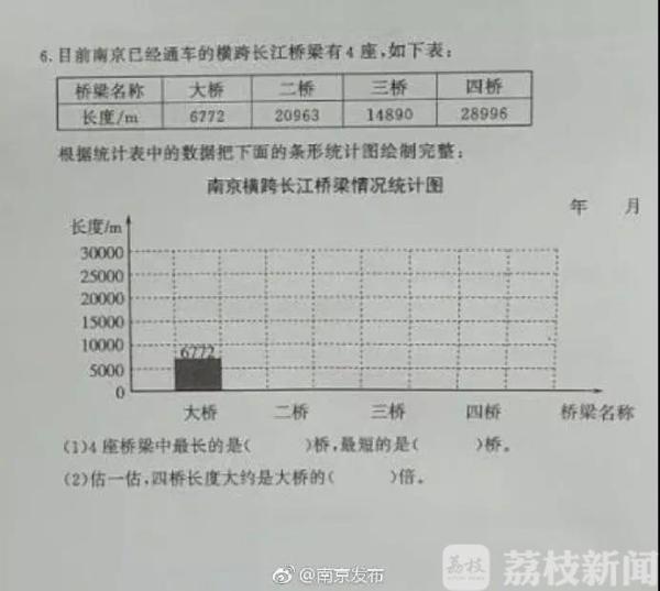 南京长江大桥2018年底重新开通,引来无数市民一睹大桥新颜,成为南京新网红。在这个考试季,它热度不减,频繁出现在各个年级的考题中。从语文到数学,考题涉及大桥的车流量、长度、标语等多个知识点。