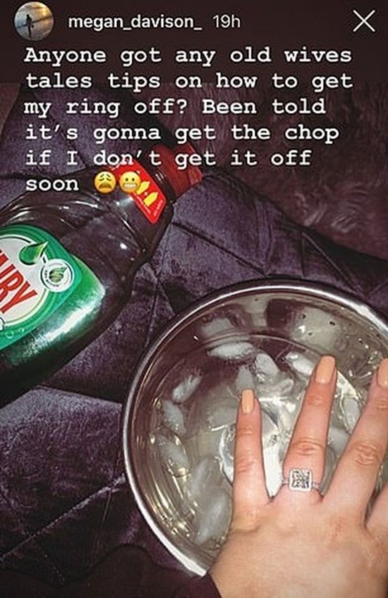 据英国《镜报》报道,日前,22岁的梅根拍下手指被戒指卡住的照片在网络上绝望求助,称自己试过清洗剂、黄油、冰块来试图把戒指取下,都不奏效。