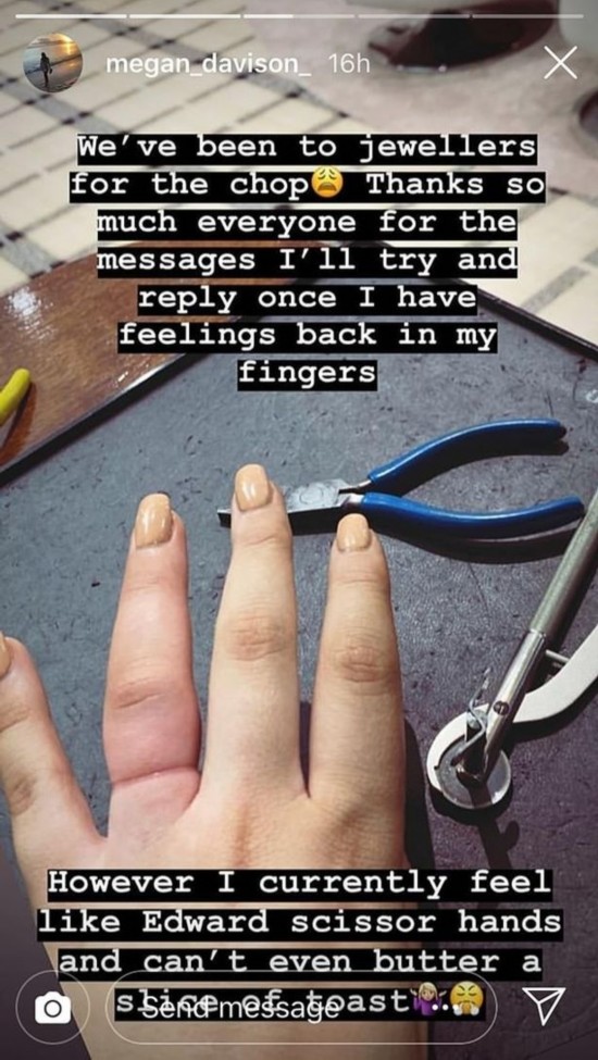 在发出求助图片的两小时之后,梅根又发布图片说,“我们已经去珠宝行把戒指截断了”,她写道:“非常感谢大家的留言,等我的手指恢复知觉后,我会尝试回复大家的。”
