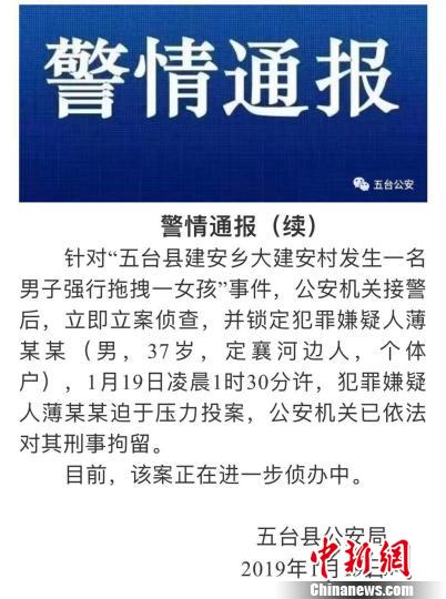 中新网忻州1月19日电 (李庭耀)山西省忻州市五台县公安局19日对外通报,针对“五台县建安乡大建安村发生一名男子强行拖拽一女孩”事件,公安机关接警后,立即立案侦查,并锁定犯罪嫌疑人薄某某(男,37岁,定襄河边人,个体户),1月19日凌晨1时30分许,犯罪嫌疑人薄某某迫于压力投案,公安机关已依法对其刑事拘留。