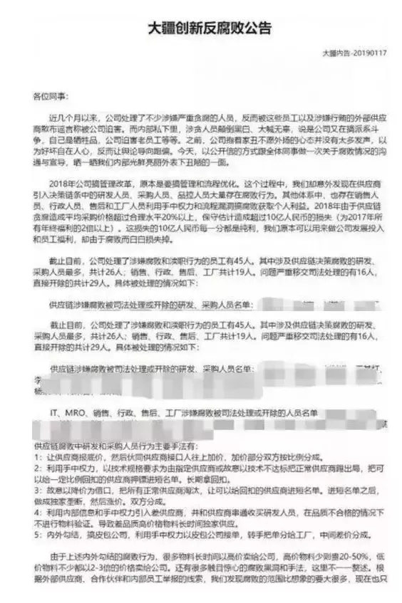 公告表示,2018年供应链贪腐造成采购价格高出20%以上,造成损失超10亿元人民币。查处了45人,其中16人移交司法处理,29人直接开除。