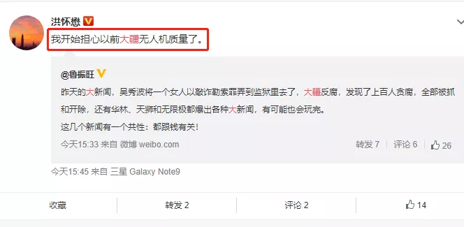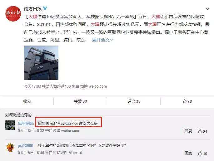 对于大疆的反腐,有不少网友拍手称好,表示大疆走在正路了,不反腐就是下一个OFO,也有调侃称终于明白产品买贵了,还有说担心之前买的产品质量问题。