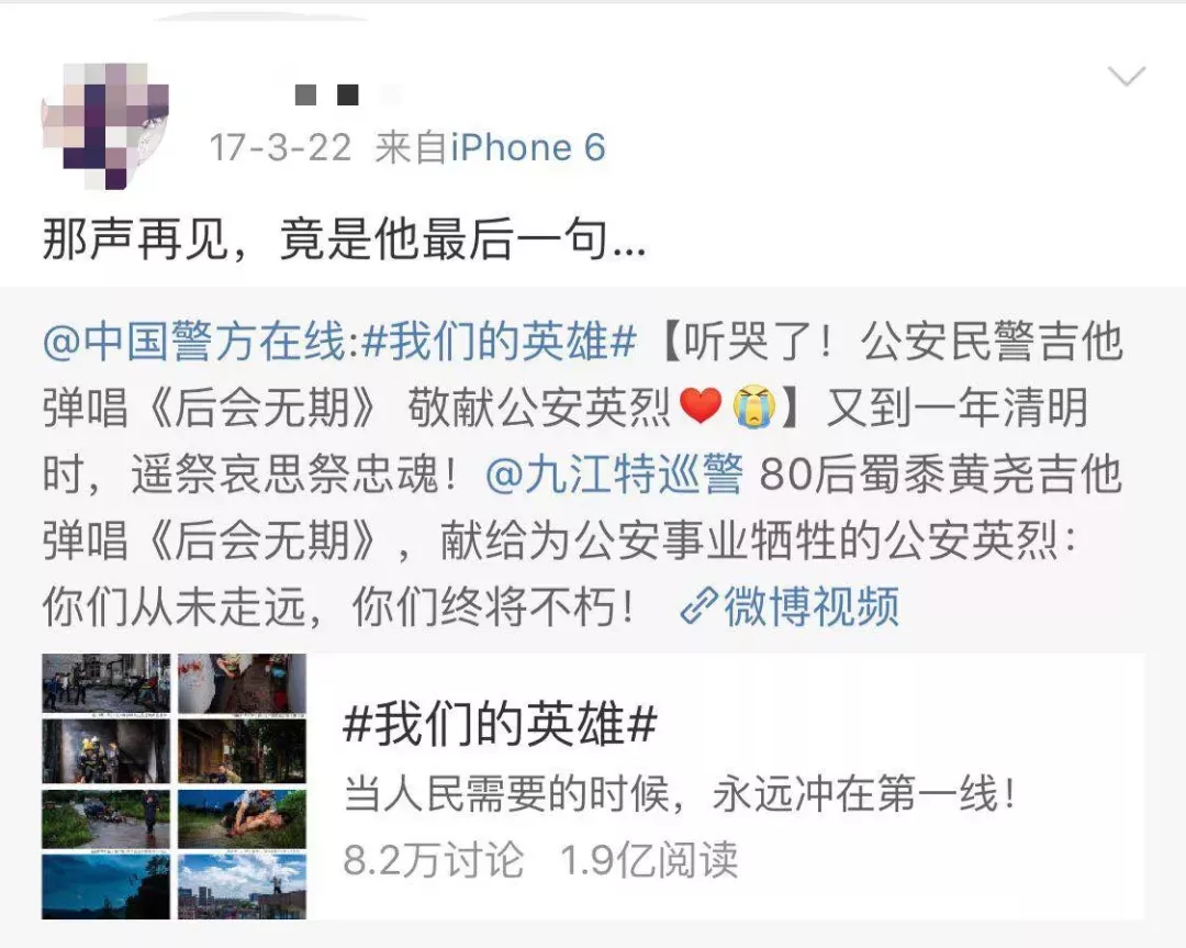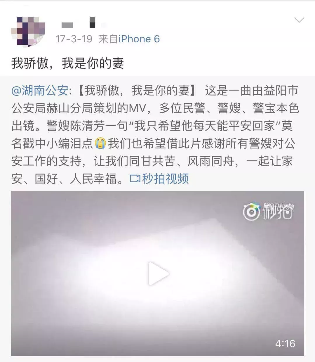 3月19日,一句话转发湖南公安的一条MV,“我骄傲,我是你的妻”。