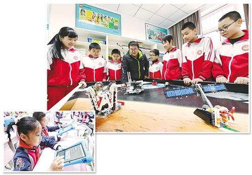 上图 承德市南营子小学学生在老师的指导下操作机器人。 牛晓雷摄