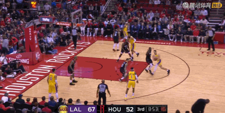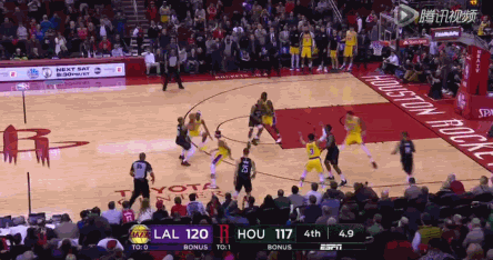 第四节最后4.9秒,祖巴茨2罚全中,湖人120-117领先,火箭叫出暂停过后,戈登面对波普的防守,直接出手三分,扳平比赛进入加时赛。