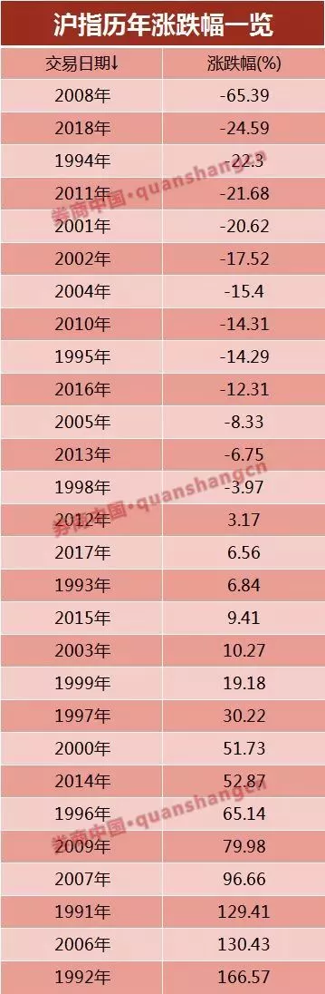 2018年沪指跌幅创下A股史上第二差表现。数据显示,2008年沪指全年下跌65.39%,系A股市场第一大年跌幅;2018年沪指以24.59%跌幅位居跌幅榜第二;沪指年跌幅超过20%的还有三个年份,分别是1994年、2011年和2001年。