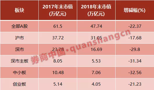 从市值缩水来看,2018年A股总市值缩水了13.76万亿元,其中沪市减少6.67万亿元,深市减少7.09万亿元。