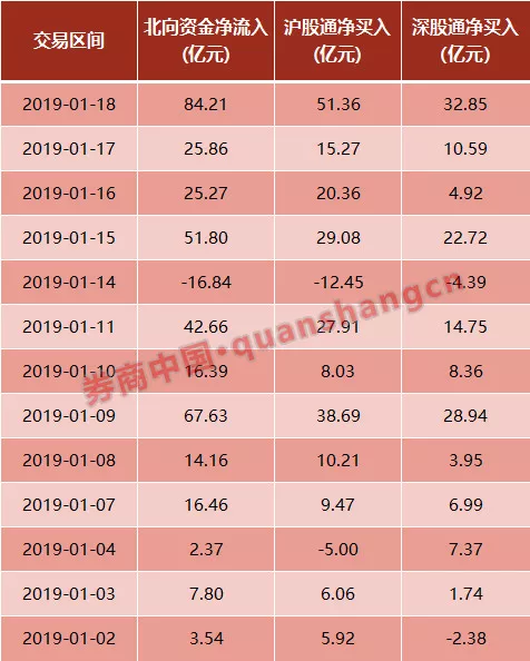 具体来看,2019年以来13个交易日,北向资金已合计净买入341.32亿元。1月18日单日净流入额最高达84亿元,紧随其后的是1月9日单日净流入67.63亿元。此外,1月15日,单日净流入额也高达51.8亿元。