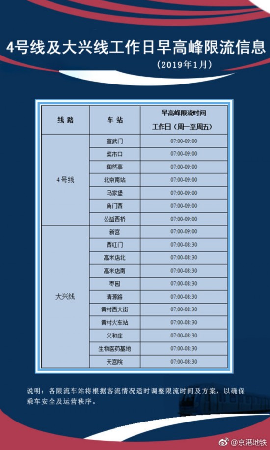 为进一步保障乘车安全及运营秩序,大兴线天宫院站至高米店北站也同时在工作日早高峰期间配合采取限流措施。2019年1月限流信息如下: