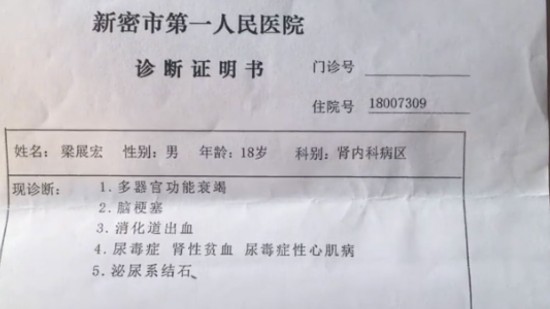 梁起超称,2017年,儿子突然浑身疼痛,就到医院去检查,后确诊是尿毒症晚期。由新密市人民医院出具的诊断证明书中,新京报记者看到,梁宏,多器官功能衰竭,脑梗塞,消化道出血,尿毒症,肾性贫血,尿毒症性心肌病,泌尿系结石。