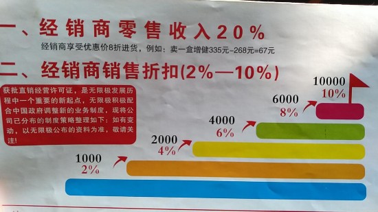 事实上,在获得优惠卡之后,消费者就已经成为无限极直销网络的一员。根据制度,这名消费者不仅可以凭8折优惠价格拿货,再以零售价转卖给其他人以赚取20%差价,还可以介绍其他消费者办卡从而发展下线。在无限极公司的制度中,下线被称为“市场”或“合作伙伴”。