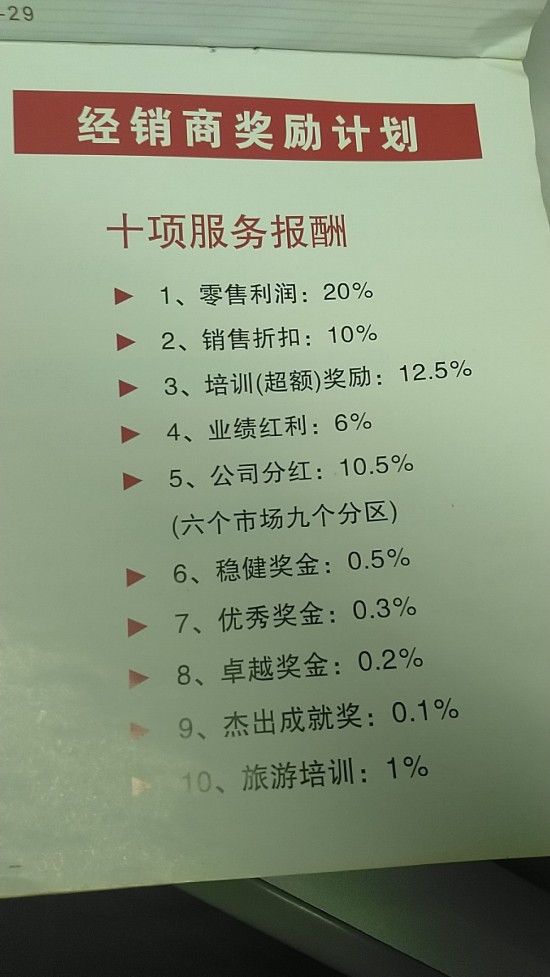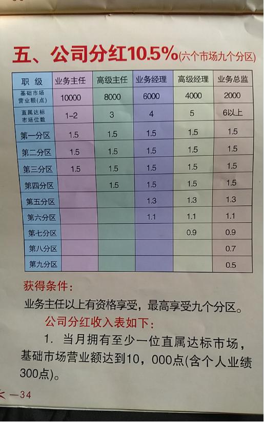 重头戏则是第5笔奖金 “公司分红”。经销商只要拥有一个直属达标市场,并且自己的业绩达到一定点数就可以获得“公司分红”。