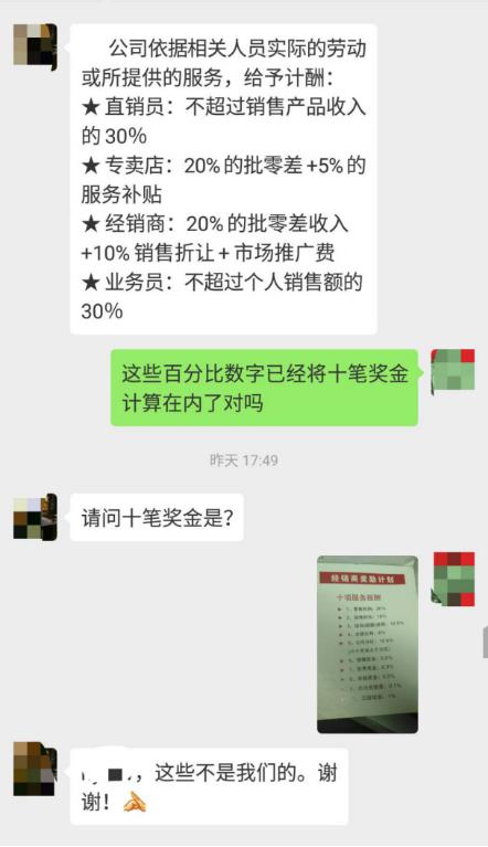 换言之,隔代下线的业绩可以帮助经销商提高奖金比例,但是“业绩红利”提成的基数还是取决于其自身的业绩。