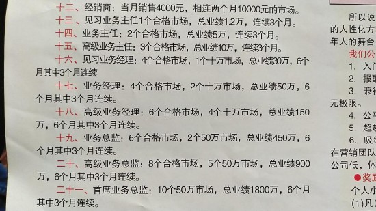 然而,“晋升”的要求十分苛刻,从最初的见习业务主任到首席业务总监之间共有9级,难度层层上升,不仅考察直属达标市场数量和累计营业额,还需要连续数月满足要求。