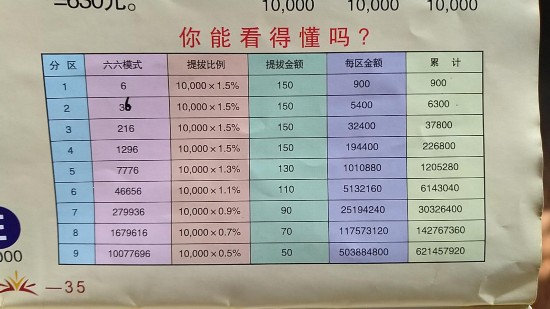 澎湃新闻记者获得的这份奖金制度材料上举了一个“六六模式”的例子,即假设一位业务总监级别的代理商有6名下线月度业绩达到1万元,而这6名下线每人又发展出6名业绩破万的下线,以此类推直至第九分区。那么,这位业务总监在九个分区内共创造出了10077696个达标市场,当月“公司分红”收入可以达到夸张的621457920元。