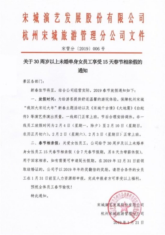 日前,上市公司宋城演艺(300144)发布春节放假通知,该通知的亮点是提到了要为30周岁以上未婚单身女员工放15天“春节相亲假”。
