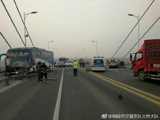 1月20日,安徽铜陵长江公路大桥上,一辆轿车与客车相撞,客车险些坠江,好在及时刹住停在桥边。目前,长江公路大桥已恢复通行。