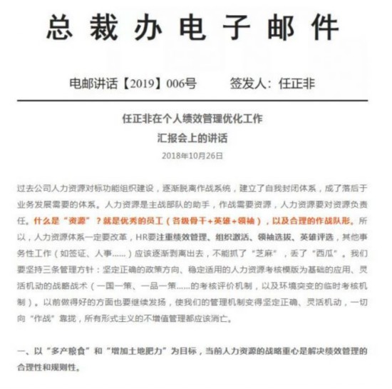 另据参考消息网了解,1月18日,华为总裁办面向所有员工发布了任正非签发的6号电邮,内容是去年10月26日任正非在内部个人绩效管理优化工作汇报会上的讲话。任正非对人力“资源”做出了一个华为式的定义,“什么是‘资源’?就是优秀的员工(各级骨干+英雄+领袖),以及合理的作战队形。”他表示:“过去我们的绩效管理过于僵化教条,用一把‘筛子’把18万员工标准化了,基层的活力还没有完全发挥出来。公司大到一定程度,有些南郭先生就掌握了行政权力,带来的后果就是更加僵化,因为只有僵化,他才好管理。”“员工也不能以功臣自居,然后‘藏’在某个职级当“南郭先生”,为什么不可以回家去看书呢?”