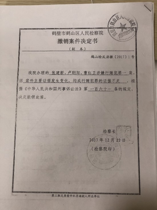 新京报记者获得的司法文书显示,鹤壁市鹤山区人民检察院在2017年12月22日,因“案件主要证据发生变化,构成行贿犯罪的证据不足”,撤销了该院办理的“张建新、卢朝阳、曹红卫涉嫌行贿犯罪”一案。