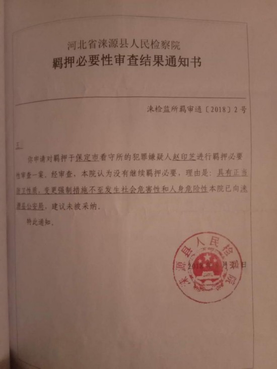 小菲告诉北京青年报记者,家里向当地司法局申请了法律援助,向检察院提交父母取保候审的申请,涞源县人民检察院也向来源警方发出《对犯罪嫌疑人、被告人变更强制措施(予以释放)建议书》。检察院认为不需要继续羁押赵印芝,因其行为具有正当防卫性质,变更强制措施不至发生社会危害性和人身危险性。