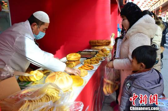 图为在化隆县年货一条街购买焜锅馍的村民们。 鲁丹阳 摄