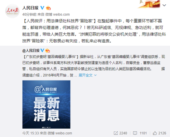 在整起事件中,每个重要环节都不磊落,都背弃伦理道德,何其恶劣?!若无科研诚信、无视律规、急功近利,就可能走邪道,带给人类巨大危害。“涉嫌犯罪的将移交公安机关处理”,用法律惩处科技界“冒险家”:无敬畏必有失控,若乱来必有追责。