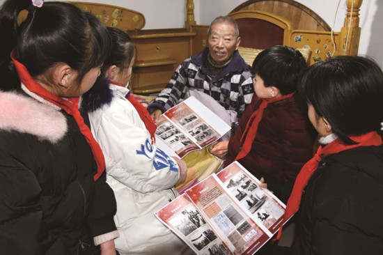 渔行实验学校的学生听老爷爷讲述泰州解放故事。小雨 顾俊摄