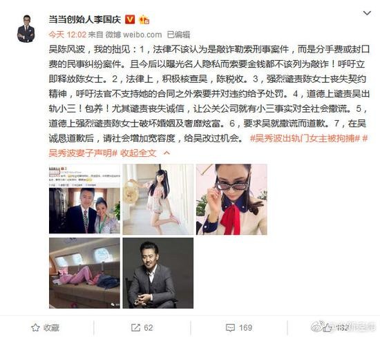 【#当当创始人评吴秀波事件#】@当当创始人李国庆 对@吴秀波 出轨丑闻一事发声,他表示,法律不该认为是敲诈勒索刑事案件,而是分手费或封口费的民事纠纷案件。他认为应该立即释放陈昱霖,并且重新审查吴秀波的税收状况,以及社会应该给吴秀波一个改过自新的机会。此前,李国庆曾因俞敏洪歧视女性事件不当言论遭大众质疑。