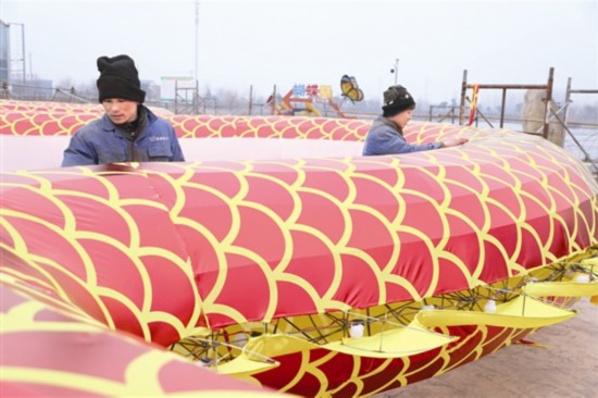 秋雪湖第三届吉祥灯会将于2月1日启幕,将以非物质文化遗产自贡彩灯为载体,通过丰富的文化演出,向世人彰显吉祥文化之乡泰州的文化底蕴与内涵。图为19日,自贡工匠正在进行灯组制作。