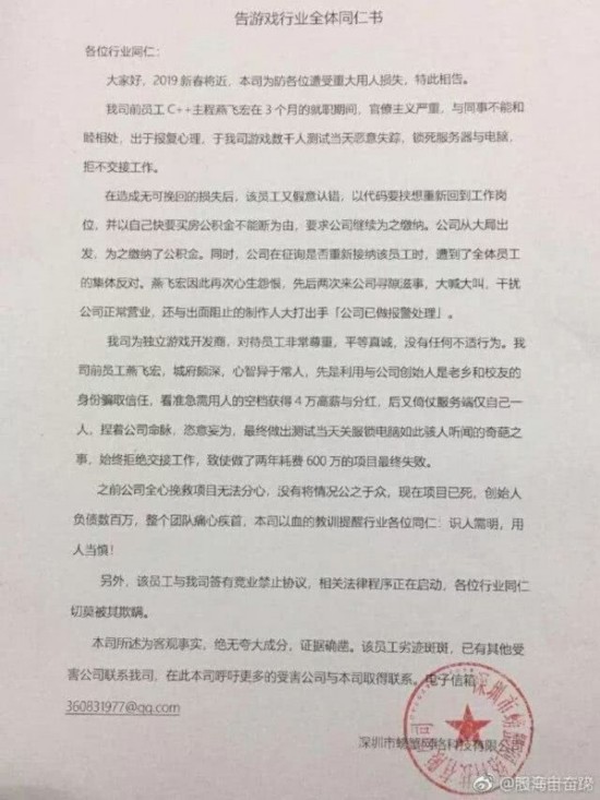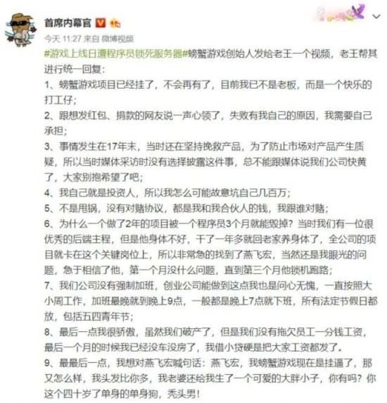 近日,微博@互联网的那点事、@首席内幕官等大 V博主相继爆料,来自深圳市螃蟹网络科技有限公司(以下简称螃蟹游戏)创始人尹柏霖发文控诉,前技术总监燕某在游戏上线测试当天(2017 年 12 月 15 日),锁死服务器与电脑,并恶意失踪,致项目失败,甚至让公司无奈之下被解散。对此,究竟是什么仇什么怨让该程序员在项目上线前夕“叛变”?这其中到底发生了什么?接下来,我们将一窥究竟。