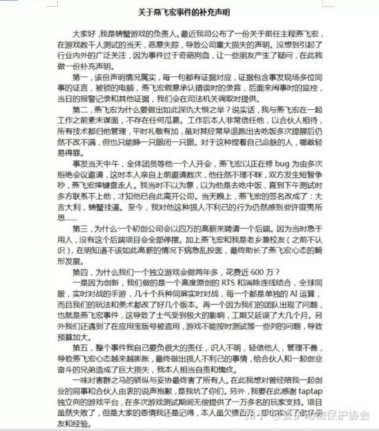 同时,螃蟹游戏还表示,燕某城府颇深,心智异于常人,依仗服务端仅自己一人,捏着公司命脉,肆意妄为。