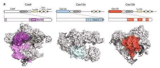 ▲Cas9、Cas12a、Cas12b三种核酸酶的基因序列模式图和蛋白质结构示意图(图片来源:参考资料[1])