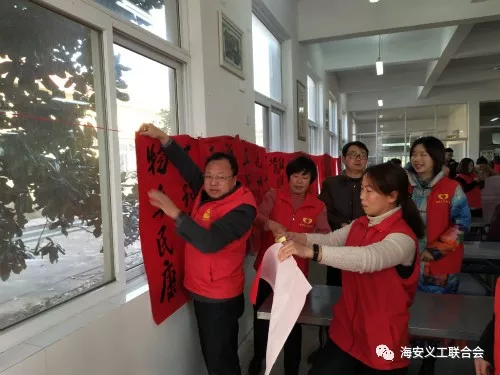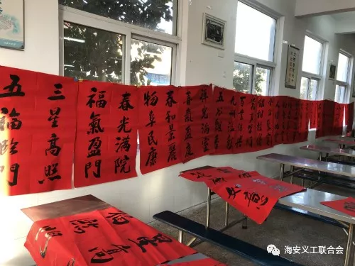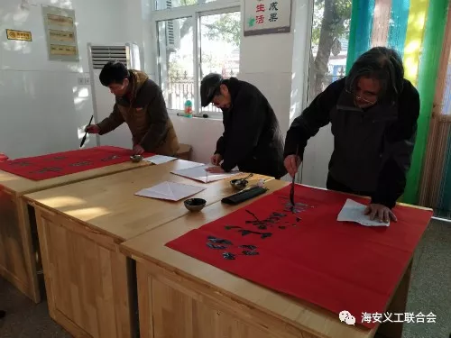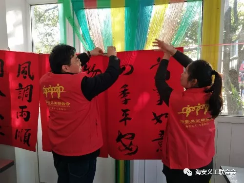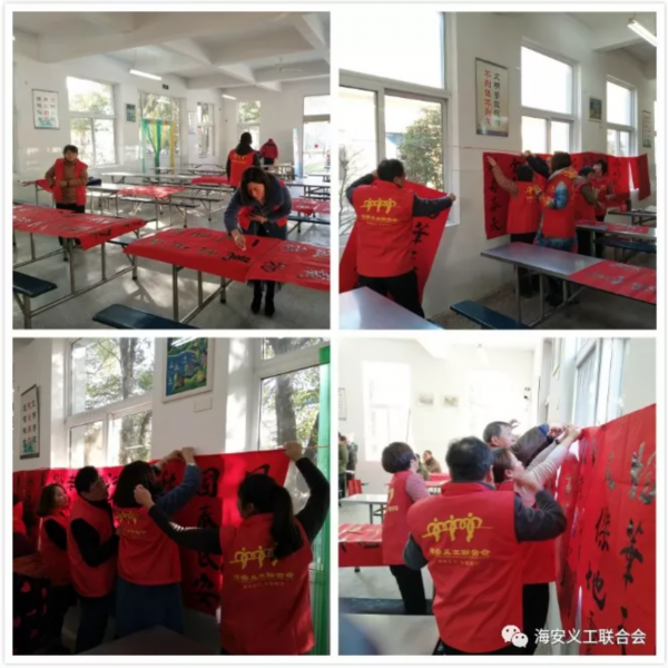 一时间,食堂里墨香四溢,红红的春联映着照进来的阳光,义工们说,真有过年的味道啦!