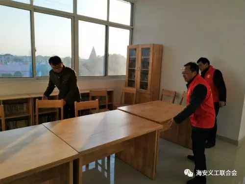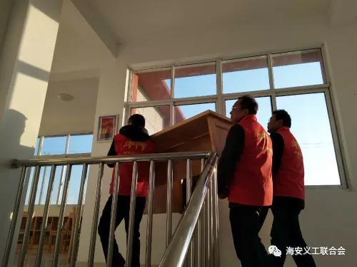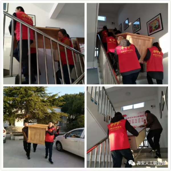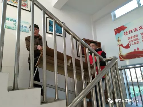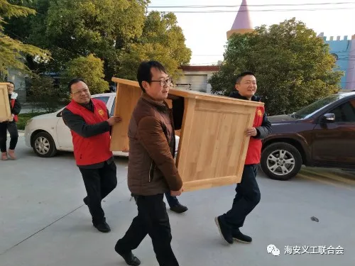 今天的活动邀请了六位海安的书画家,现场给孩子们写春联,送福字。可食堂里的条桌太窄了没法将纸摊开写字,怎么办?校长说楼上有,可是太重!义工们脱掉外套,撸起袖子,到底有多重,还不信了!
