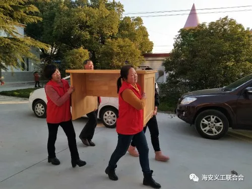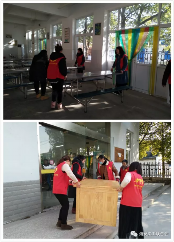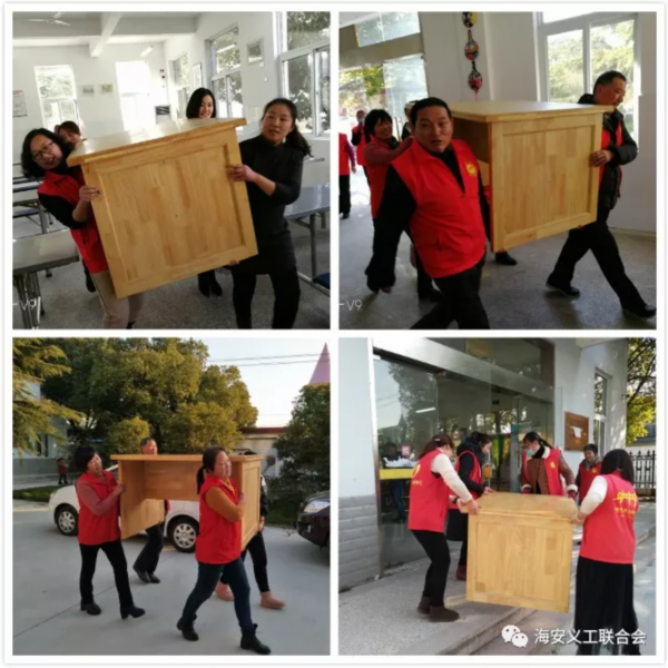 小编已惊呆!肩扛手搀,一共六张桌子,分别从办公楼的三楼和二楼搬到食堂里。巾帼一样不让须眉,一个大写的“服”!