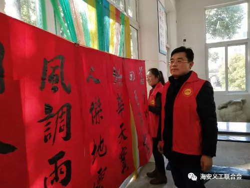 义工们帮助把写好的春联摊放在桌上吹干墨迹,再一幅幅悬挂到两边的墙面上。